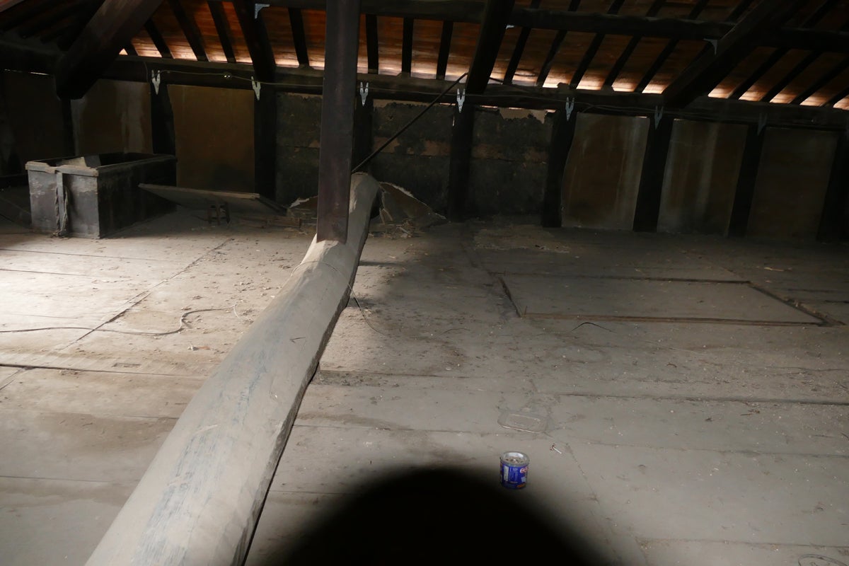 屋根裏もとても広いのですが、熊本地震の影響で土壁が壊れていたり、
