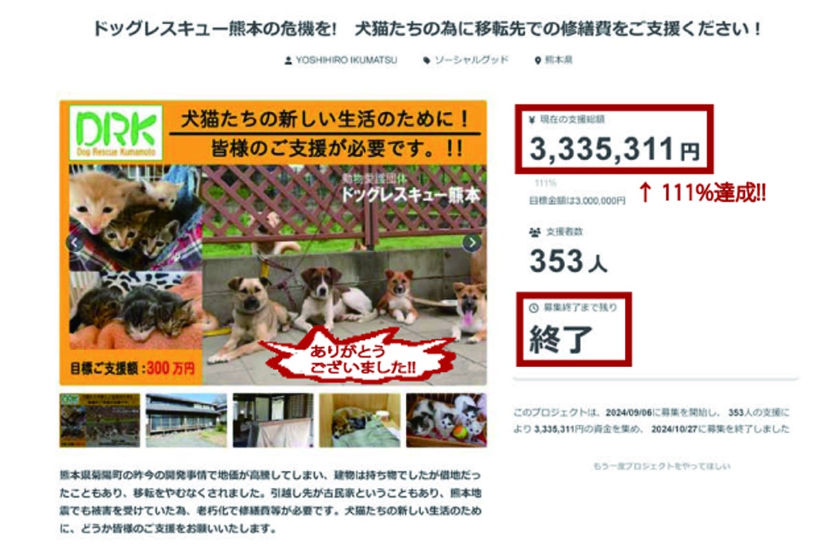 2024/10/28 12:40ドッグレスキュー熊本 代表の生松義浩です。昨日にて、当クラウドファンディングが終了いたしました。皆様のご支援とご協力ののおかげで、目標を達成することが出来ましたこと深く感謝申し上げます。本来であれば直接お会いして御礼を申し上げるべきところですが、大変恐縮でございますが、メールにて失礼させていただきます。本当にありがとうございました。 もっと見る