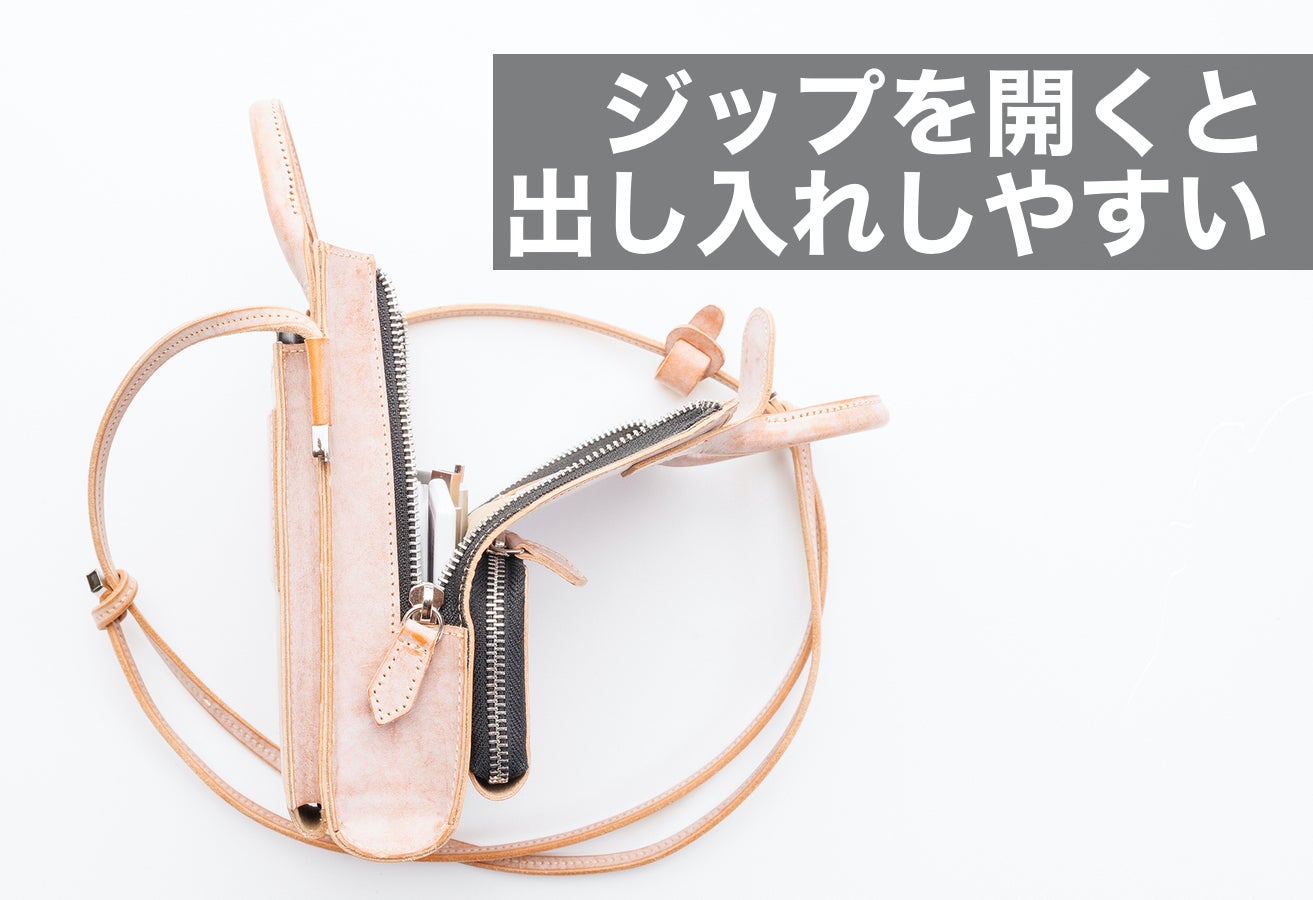 レザーは経年変化が楽しめる、イタリアトスカーナの高級レザーを使用した大人のスマホポーチ。ZIPを開くとボディーが折れる構造で使いやすさと収納力UPを実現しています。