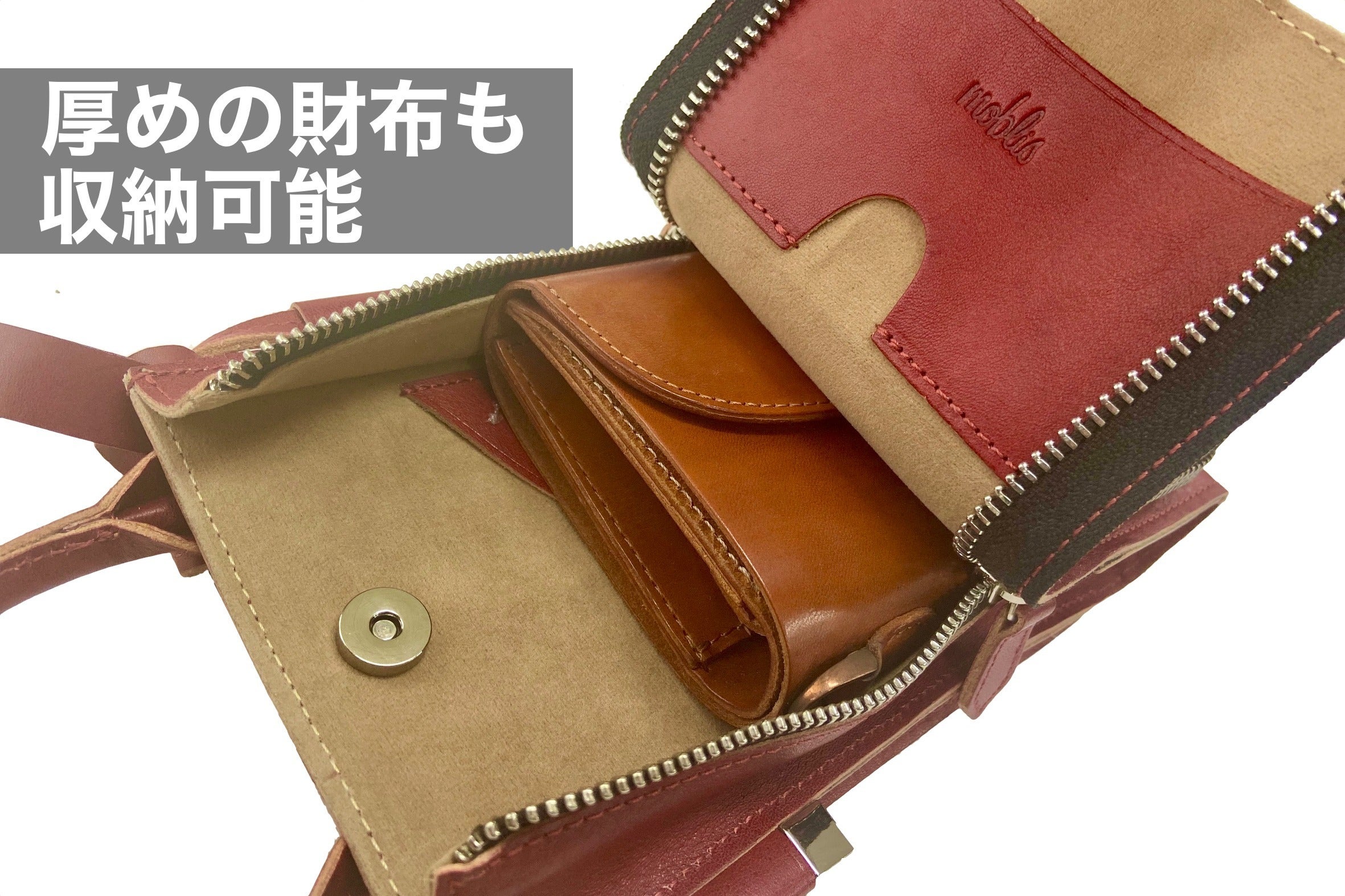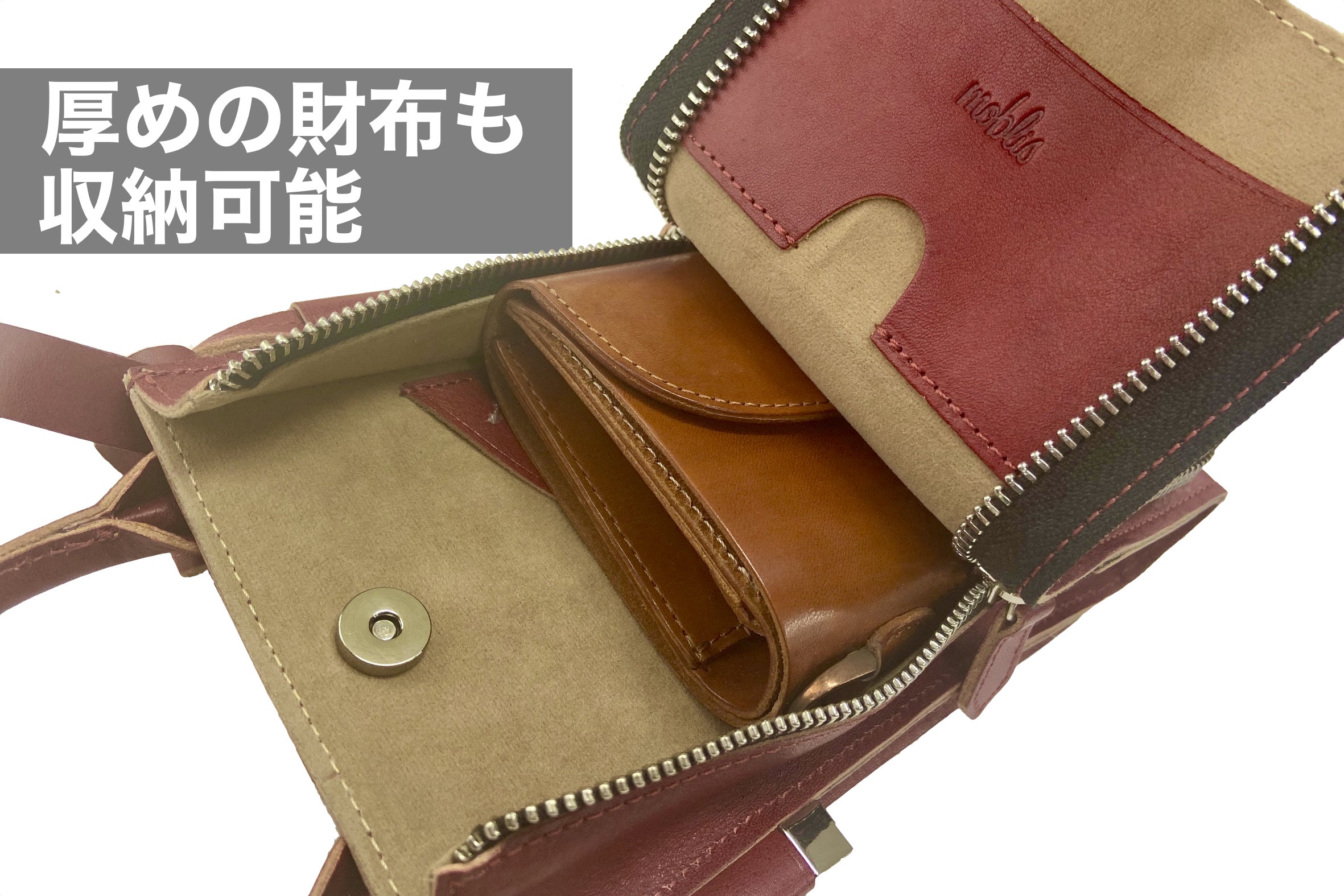 マチを4.5cmに改良し、コンパクトさはそのままに、収納力を向上させました。小さめの財布はもちろん、厚めの折りたたみ財布も収納可能です。