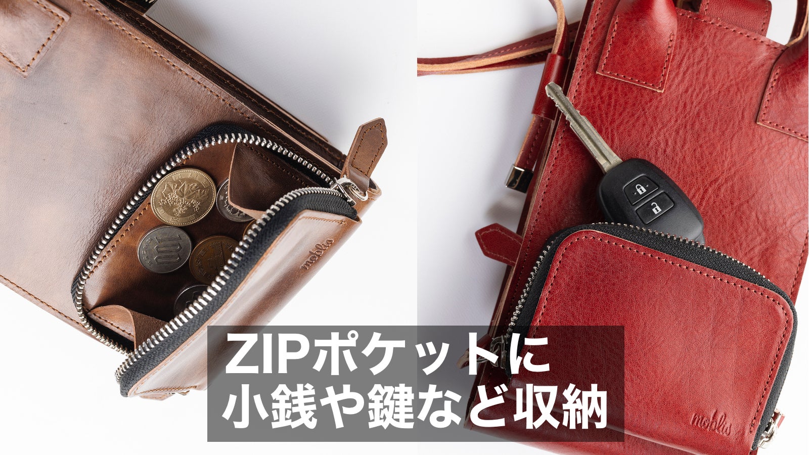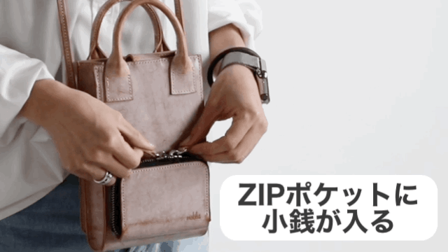 ZIPポケットには小銭や鍵、イヤフォンなどを収納可能です