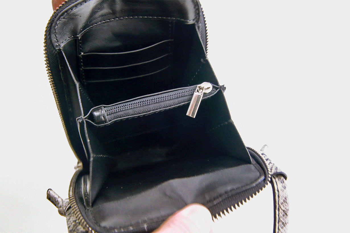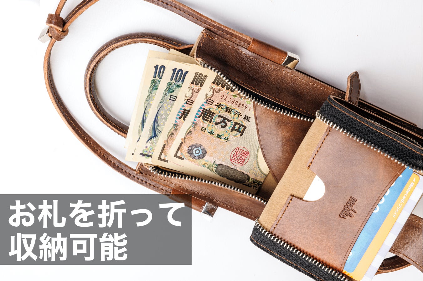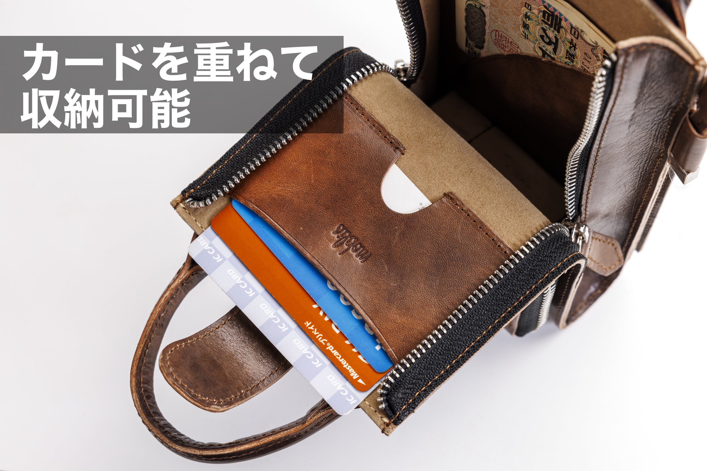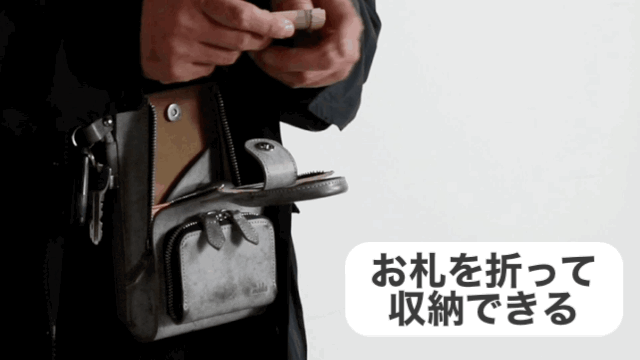 ボディー内を圧迫しないよう、お札フォルダーをつけました。お札を2枚に折って5〜10枚収納可能です