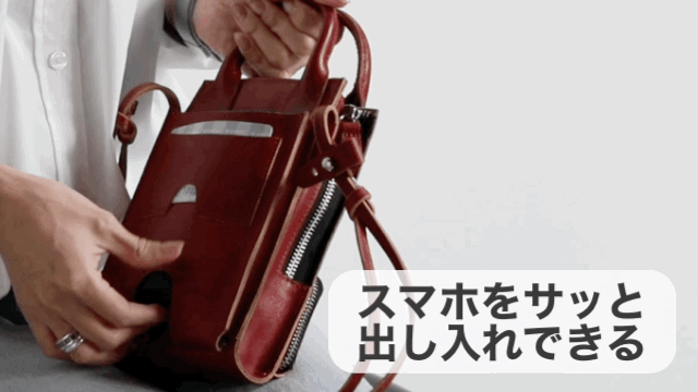 1,間口が広いサイドZIPで、「サッ」とアクセスできる、新モデル多機能スマホポーチ 2,マチで、コンパクトさと収納力を両立。スマホに加え、財布・小銭・カードなども収納 3,イタリアの伝統製法「ベジタブルタンニンレザー」は違いが判る大人の高級感