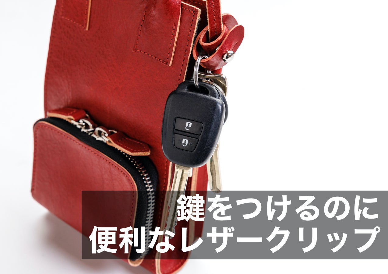 レザーホルダーで、手持ちの時にショルダーを結んだり、鍵などをクリップできます。