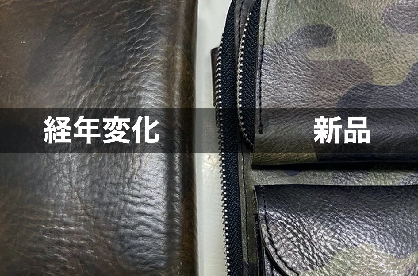プリントではなく、迷彩の柄に染料を染み込ませて、乾かし、また色を変えて塗りを繰り返し、仕上げた革です。日焼けやアタリにより、色艶が変化していきます。