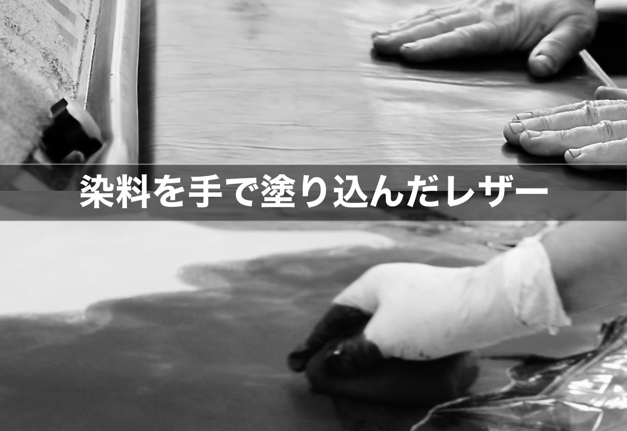 ヌメ革の上に染料を手で塗り込みプレス加工をした発色のいい革です。ブラウンは色を塗る際わざとムラ感を出しています。使い込む度に艶感や色変化を楽しめます。