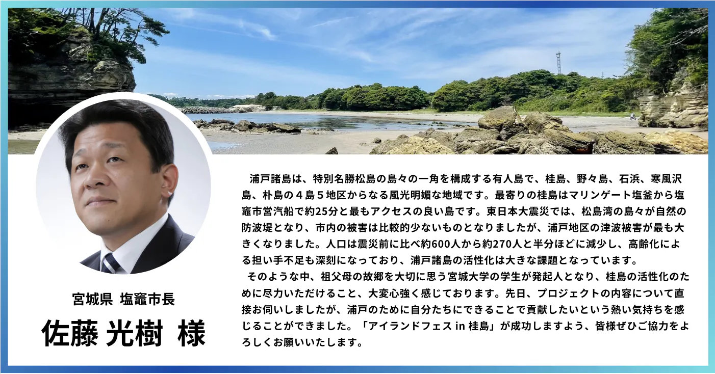そのプロジェクトの一つが、今回の「アイランドフェス in 桂島」です。実行委員会は宮城大学 34 名・東北芸術工科大学1名の計 35 名で構成されております。クラウドファンディングは今回が初挑戦です!皆さまに私たちの想いが届くように願いを込めて、このページを作成しました。ぜひ最後まで読んでいただけると嬉しいです!
