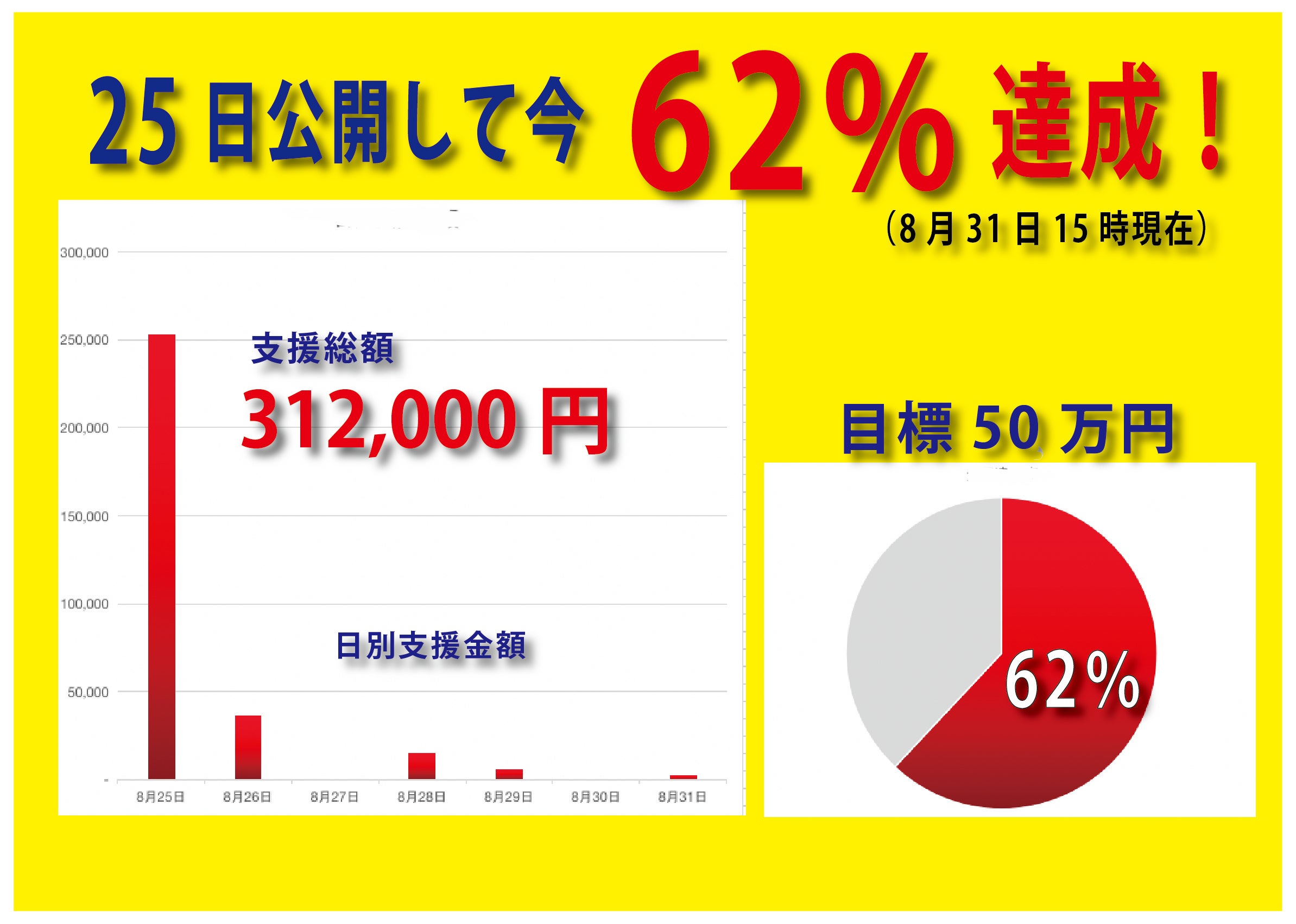 台風10号は15時現在和歌山県・潮岬の南東の海上を東南東へ進んでいるようで、今後東海では激しい雨が続くそうです。進路にあたる方は充分ご注意下さい。また被害に遭われた皆様に心よりお見舞いを申し上げ、一日も早い復興を願っています。さてヤワキン展のために50万円を目標にしたクラウドファンディングですが開始してちょうど1週間が経ちました。現在22人の方から31万2,000円のご支援をいただき62%の達成となっています。                         (8月31日15時現在)短期間に多くのご支援、本当にありがとうございます。皆様のお陰でとても素晴らしいスタートダッシュが切れました。厚く御礼申し上げます。初めてのクラウドファンディングで果たしてご支援がいただけるのか、ハラハラドキドキしながら一日に何回もこのプロジェクトを開いていました(笑)。クラウドファンディングでは2週目以降、しばらくは「コツコツ期」というそうで、開始時の支援の勢いは影を潜め、コツコツと着実に増えていく時期だそうです。この活動報告をご覧の皆様、ぜひSNSなどでコツコツとこのプロジェクトを宣伝頂けますよう心よりお願い申し上げます。なんとしても50万円の目標を達成して素晴らしいヤワキン展にしたいと思いますのでよろしくお願いします。