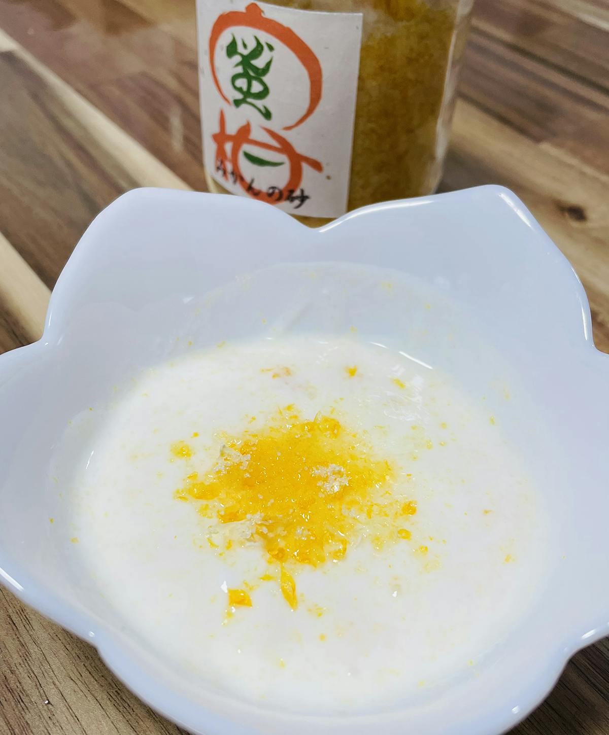 おすすめの食べ方は、みかんの砂をヨーグルトに混ぜて、果肉入りヨーグルトに大変身♪