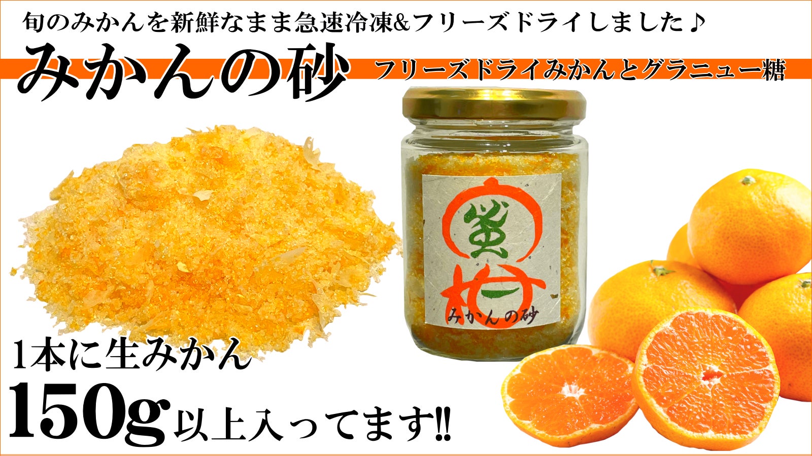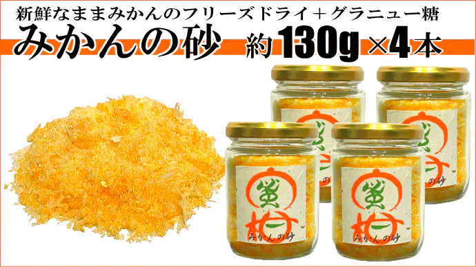 地元の山川みかん、和水みかん、立花みかんなど、産地のみかんに厳選し、新鮮なままの果実を急速冷凍、その後、フリーズドライし、相性の良い「グラニュー糖」と合わせることで、みかんの酸味と甘みを存分に活かした新商品【みかんの砂】が誕生しました!