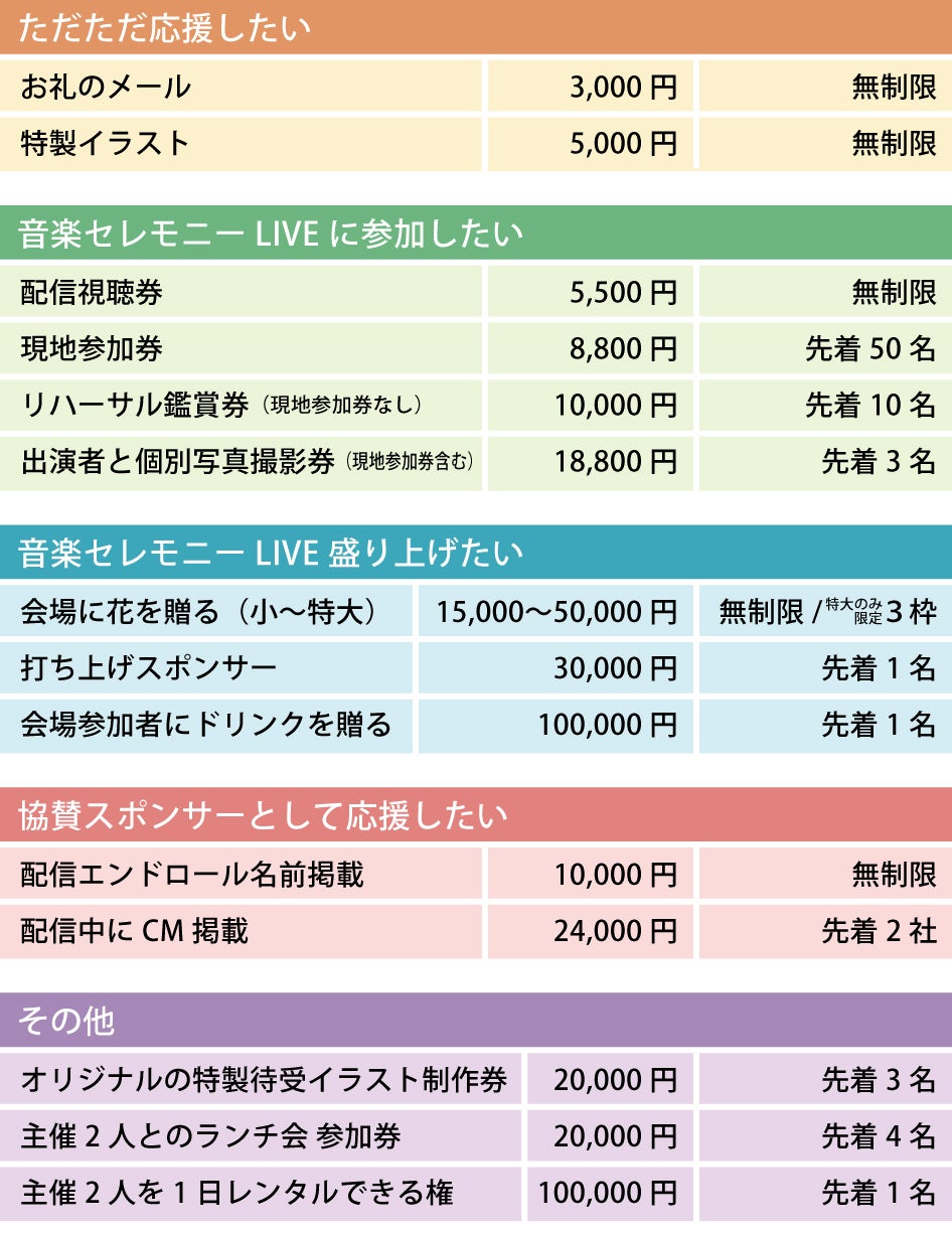 クラウドファウンディングは、セレモニーライブの参加権や、ライブを盛り上げる支援がいろいろ。ライブでミライの先取りをする、ライブを創りあげる部分に支援する、主催者とふれる、あなたの心が喜ぶ関わりでご参加ください。
