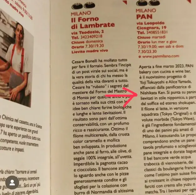 PAN' MILANO(日本風のパンを販売するブレッドカフェ)の立ち上げのパン職人の協力として名前が載りました。