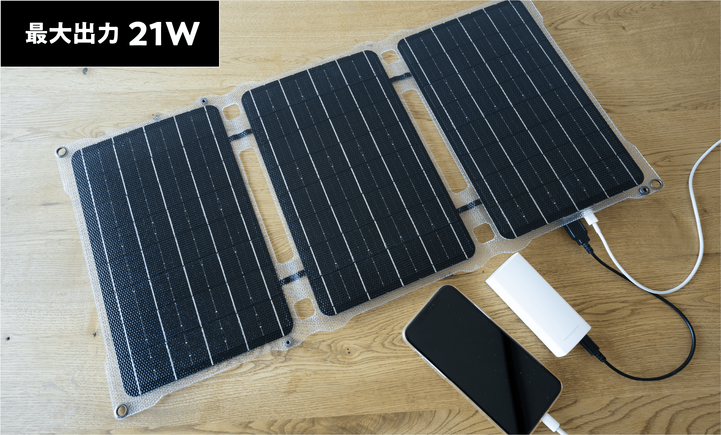 最大出力は21Wと通常の携帯用ソーラーパネルが10W程度に比べて高出力なので、複数のデバイスを同時に充電できる上に、充電速度も速く、時間を大幅に抑えられます。
