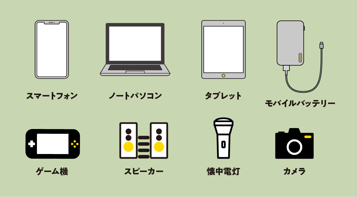 スマートフォン、ノートパソコン、タブレット、スピーカー、ゲーム機、懐中電灯、カメラ、モバイルバッテリーなど、様々なデバイスに電力を供給することができます。