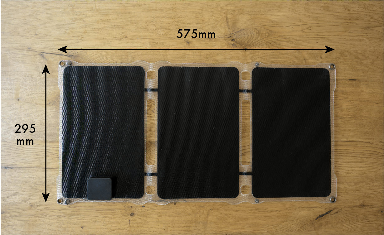 ソーラーパネルは面積が大きい方が充電パワーが大きくなるので、十分に充電ができる面積を確保しました。
