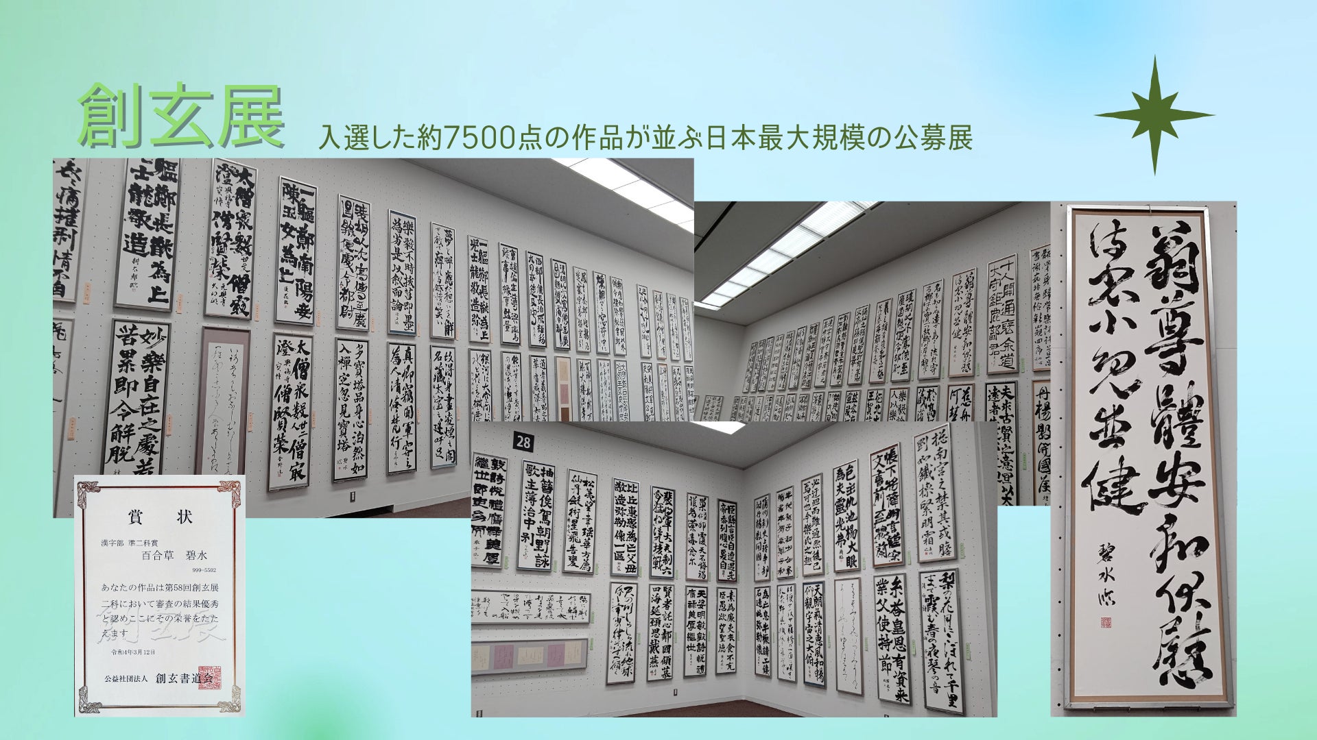 書道は2021年に日本の「登録無形文化財」に登録されました。そして、2024年に「ユネスコ登録無形文化遺産」登録に向けた提案が決定、2026年の登録を目指しているところです。書道をする人の数は少子化で年々減っており、書道用品店の閉店も余儀なくされていますが、書道作品を観てもらうことで、書道の魅力が世界へ届けば良いなと思います♪