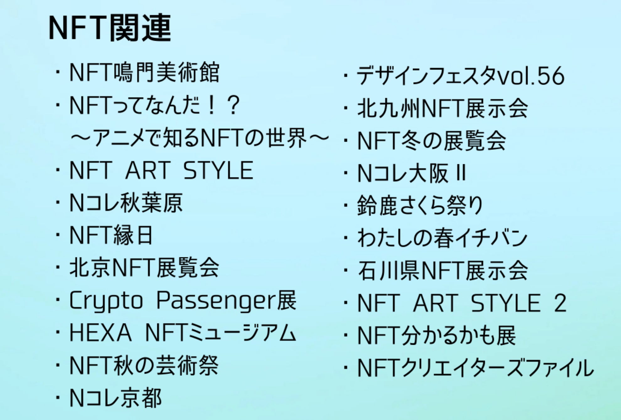 NFT界隈では最初から書道に興味を持っていなかった方々も沢山いるからこそ、NFT展示会にはたくさん出展しています。下記は一部ですが、この2年間でもたくさんの展示会で作品を展示しました。書道の公募展には公募展の魅力がありますが、公募展には出せないような作品も作成したり、より身近に感じられるような雰囲気にしたり、試行錯誤しながらNFT作品を作りました。
