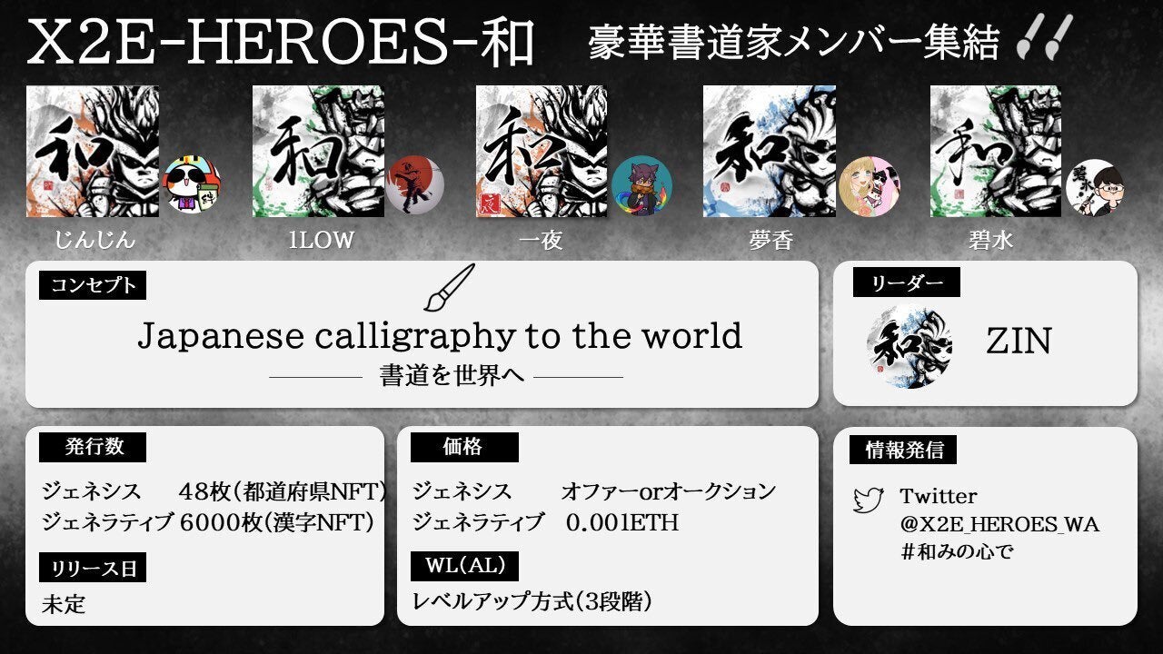 また、NFTでは書道プロジェクトが立ち上がったこともあります。リーダーZINさんのもと、リードデザイナーのエースさん、そして5人の書道家が集まり、「書道を世界へ」をコンセプトに「X2E-Heroes-和」が始動しました!