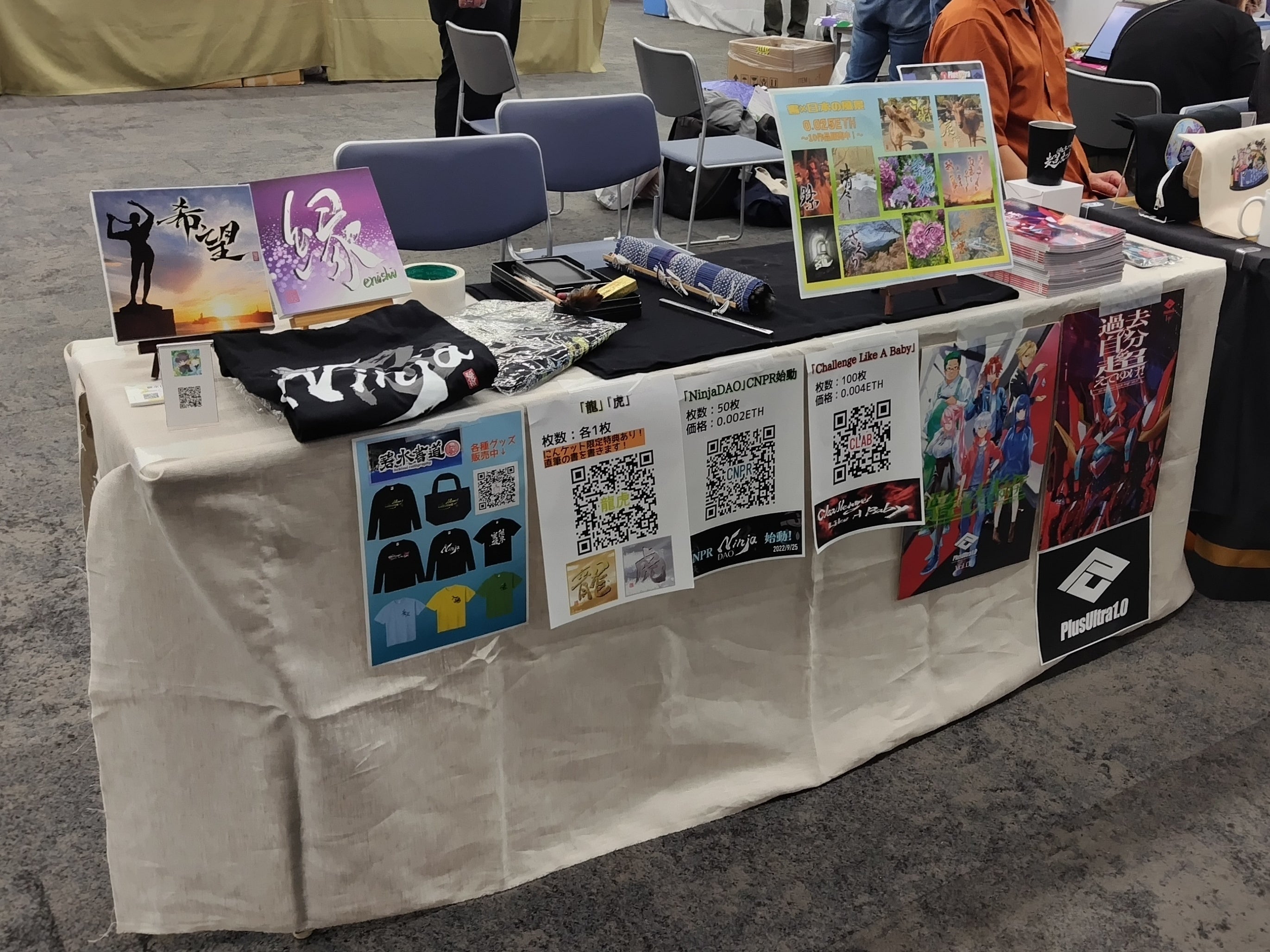 NFT関連のイベントにもブース出展させていただいたこともあります♪写真はNinjaDAO主催の「にんケット」というイベント。山鳥、孔雀といった珍しい毛の筆など色々な筆を持っていき、ブースに立ち寄ってくれた方々に無料体験していただきました🖌Tシャツをはじめとするグッズはオンラインでも販売しています。