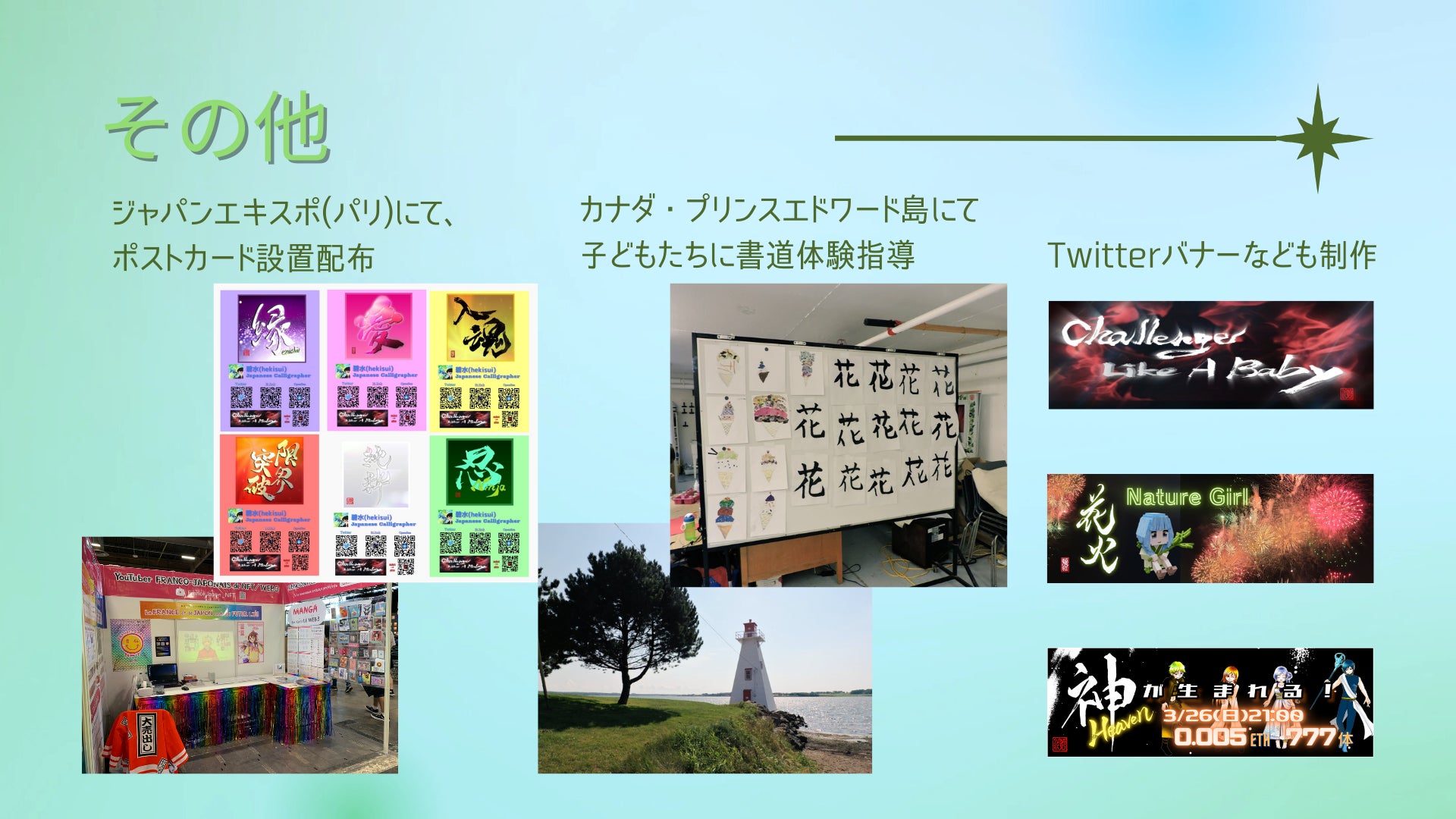 海外に向けた取り組みとしては、「北京NFT展覧会」に出展しました。現地へは行けませんでしたが、初めて海外でのNFT作品を飾っていただきました!パリで開催されたジャパンエキスポでは、Megumiさんの出展ブースにポストカードを置かせてもらい無料配布。ポストカードは全て来場者の手に渡りました。フランス・ボルドーではプロムナード・サント・カトリーヌショッピング センターにて「愛」をモニター展示しました。また、カナダ・プリンスエドワード島には現地へ赴き、子どもたちに書道体験をしてもらったこともあります。