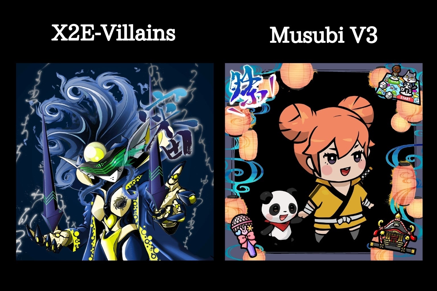 他にも、「X2E-DAO」率いるaki社長の二次創作ジェネラティブNFT「X2E-Villains」にも筆文字をご提供したり、「NinjaDAO」のプロジェクトである「Musubi V3」では漢字パーツ担当として、関わらさせていただきました!