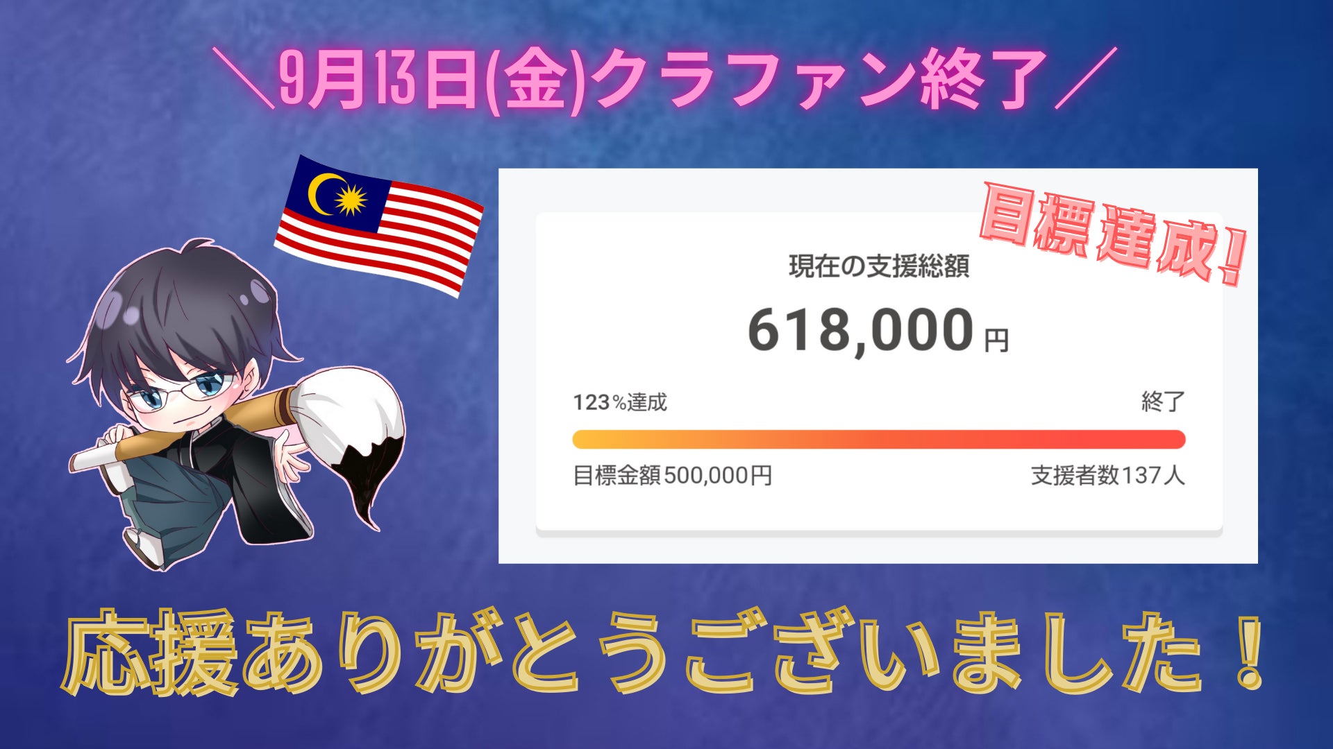 クラファンリターンについて、順次対応しております♪下記のリターンは既に発送しました!もし届いていないなどありましたら、ご連絡くださいね!【筆文字長袖Tシャツ「Ninja-忍-」 】【「過去の自分を超えてゆけ!」ステッカー】【「過去の自分を超えてゆけ!」タンブラー】届いたというご報告もお写真と共にいただきました!そして、【筆文字オーダーメイド半袖Tシャツ】 は、11月5日に発送予定になります!お楽しみにお待ちください♪【支援証明SBT】 【マレーシアで撮影した写真/動画】(ダイジェスト動画)はこれから作成しますので、しばらくお待ちください!12月頃締切の作品も鋭意制作中なので、ちょっと遅くなるかもしれませんが、お待ちくださいね!引き続きよろしくお願いします。