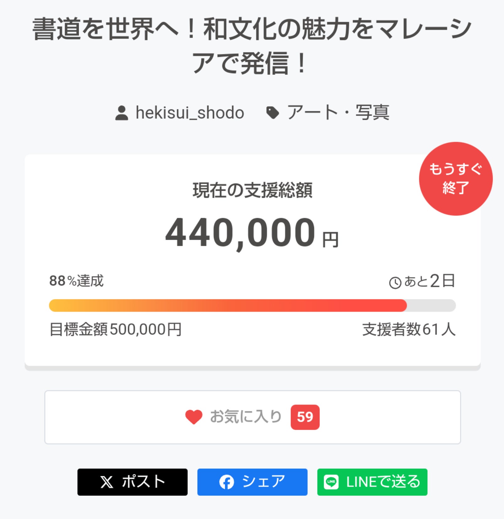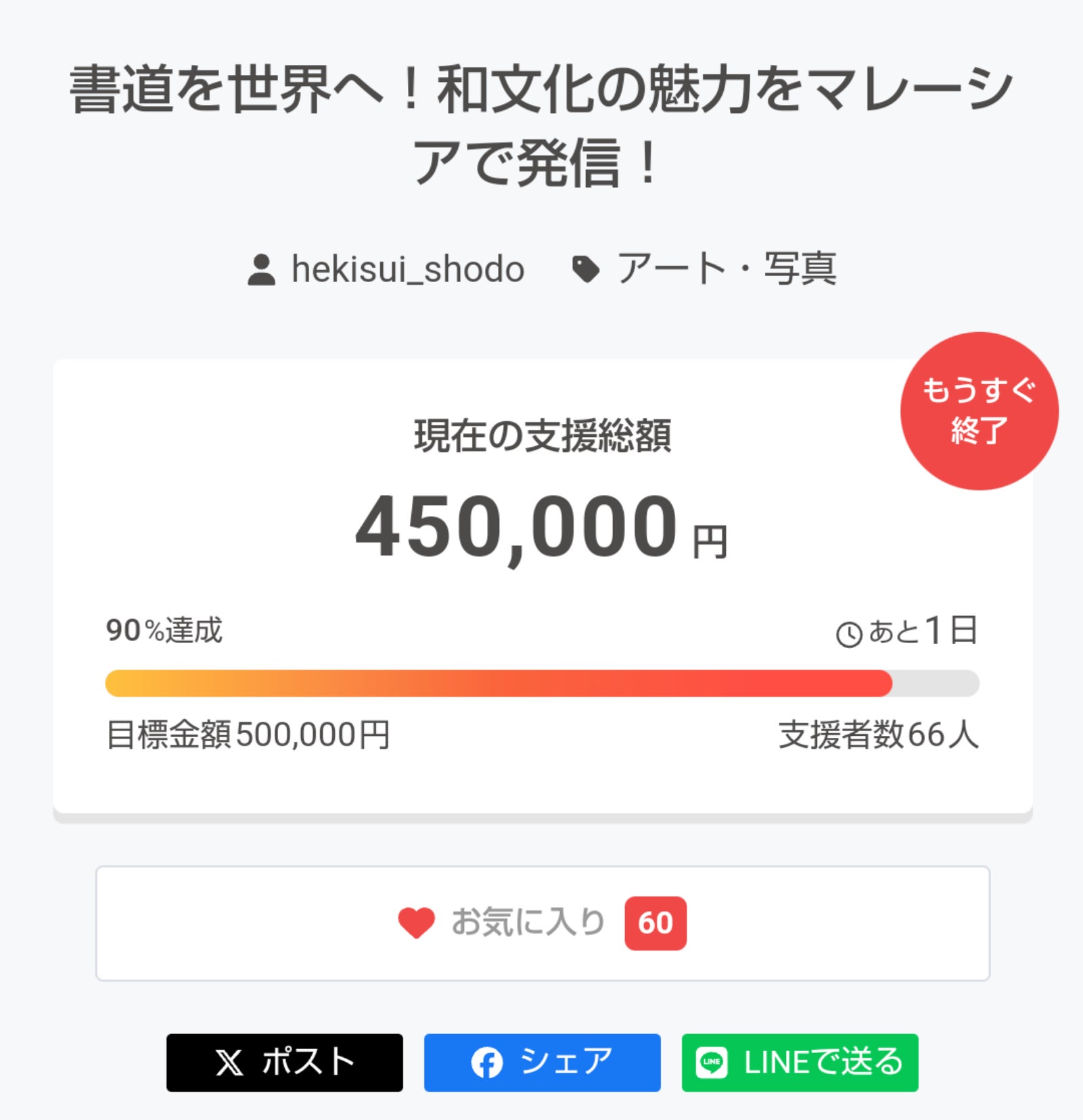 クラファン終了まであと1日となりました!追い支援をしてくださる方もいて、じわじわと目標金額に近づいてきております。本当にありがとうございます!目標達成まであと5万円!リターンも追加しました。・ちょこっと支援 500円・墨を差し入れする権利 1000円・全力で支援(年賀状付き) 15000円・マレーシアで撮影した写真/動画 1500円9月13日(金)まで頑張りますので、引き続きよろしくお願いします!
