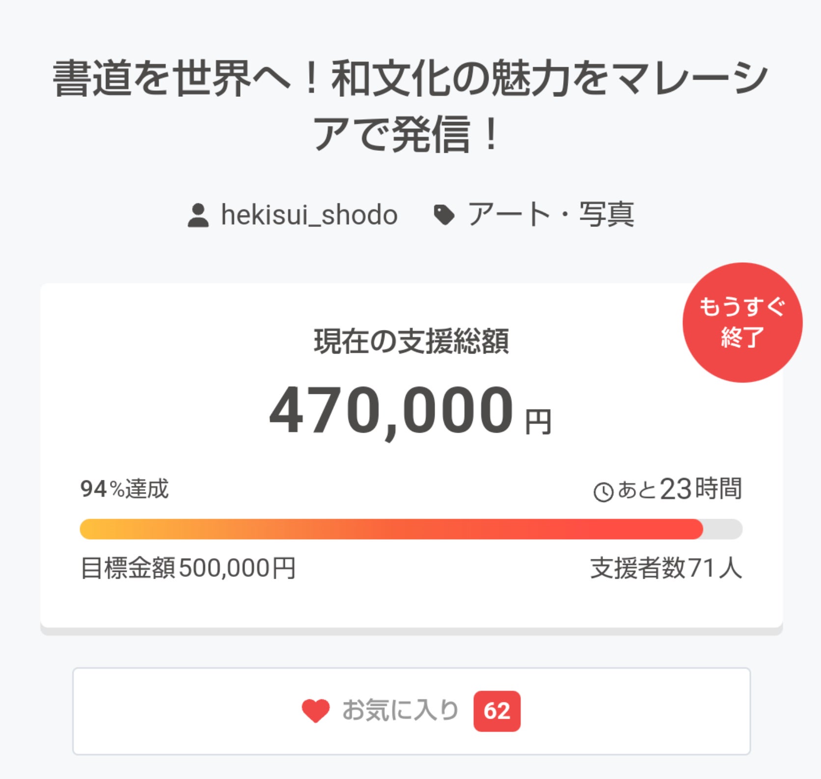 連日ご支援をいただいており、目標金額50万円達成への兆しが見え始めてきました!!目標達成まであと6万円!9月13日(金)がクラファン最終日となります! 達成に向けて頑張りますので、引き続き応援のほどよろしくお願いします!これまでご支援していただいた皆様、本当にありがとうございます。