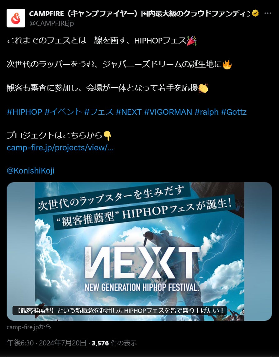 CAMPFIRE公式XにNEXT2024のクラウドファンディングの情報を掲載していただきました!