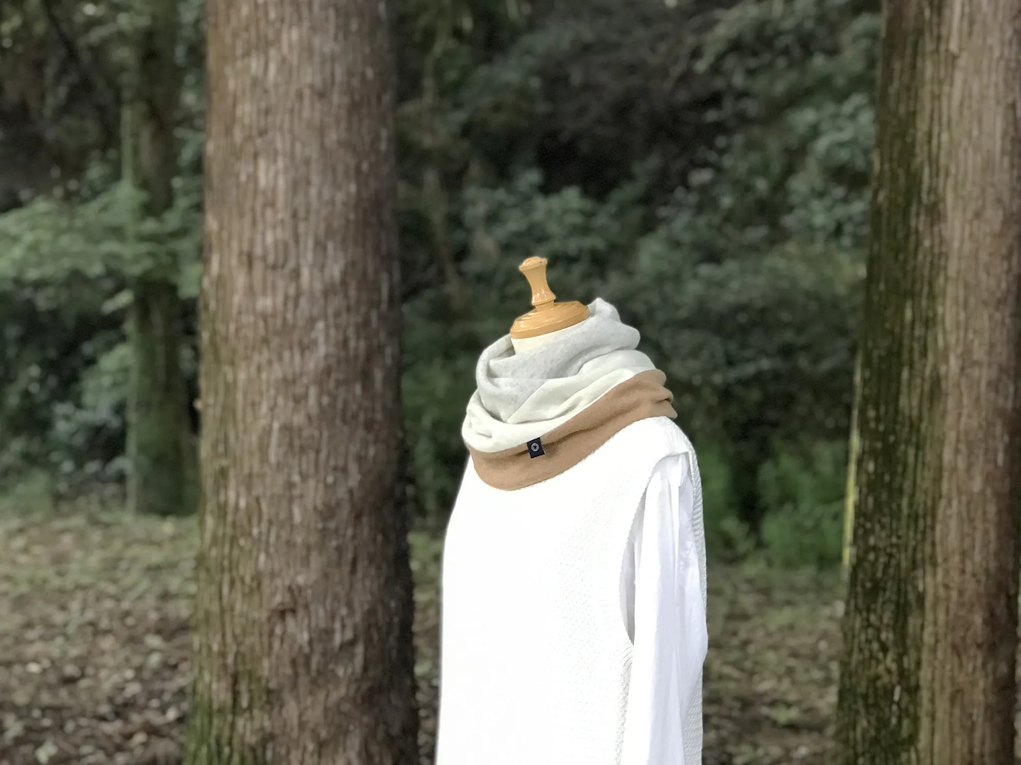 抜群の肌触りと絶妙な膨らみを持つ薄手カシミヤ素材をねじりながら二重構造にすることで空気層を内側に包み込み、すっぽり着用するだけで自然にねじれた表情となる様、設計・デザインしています。