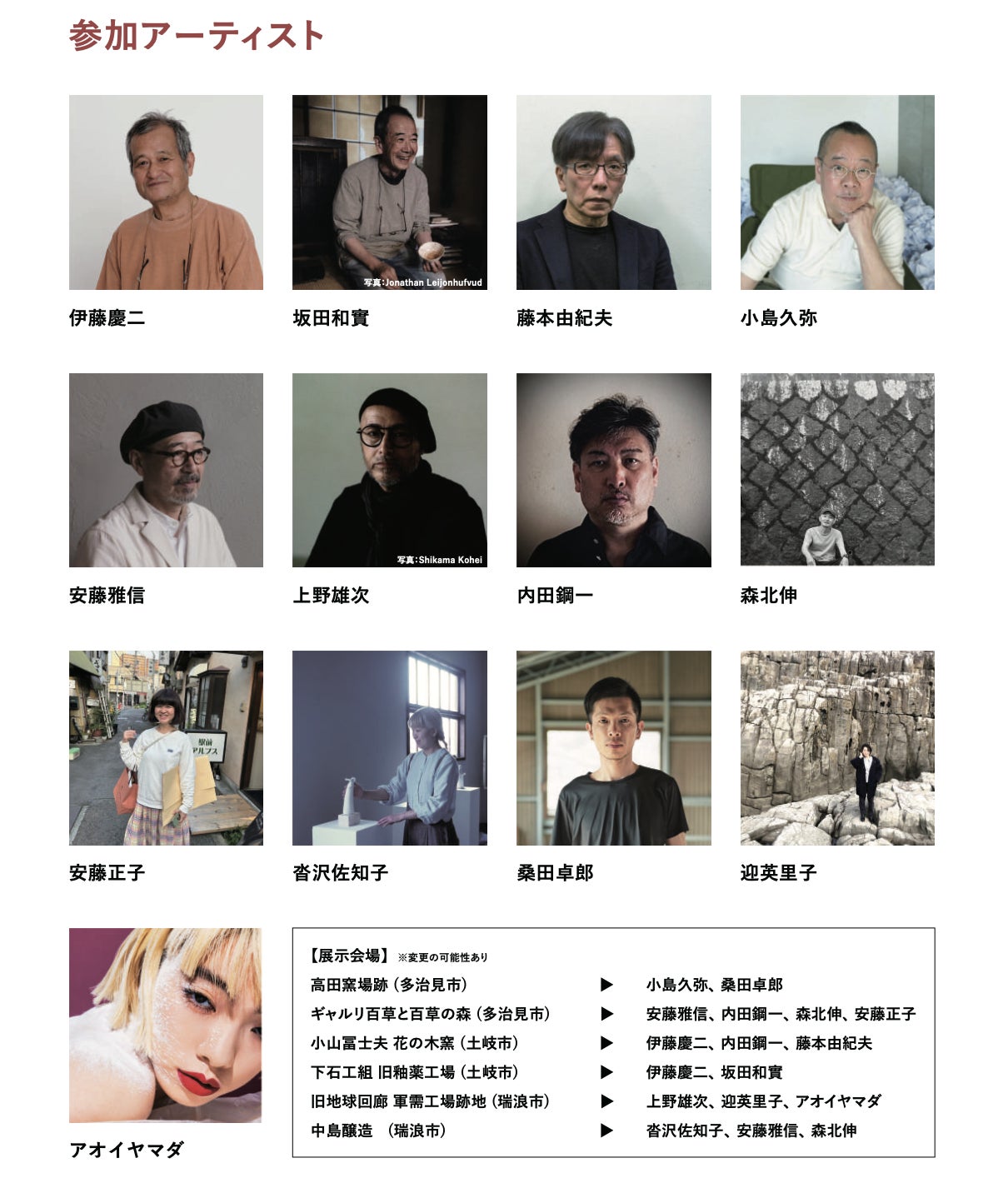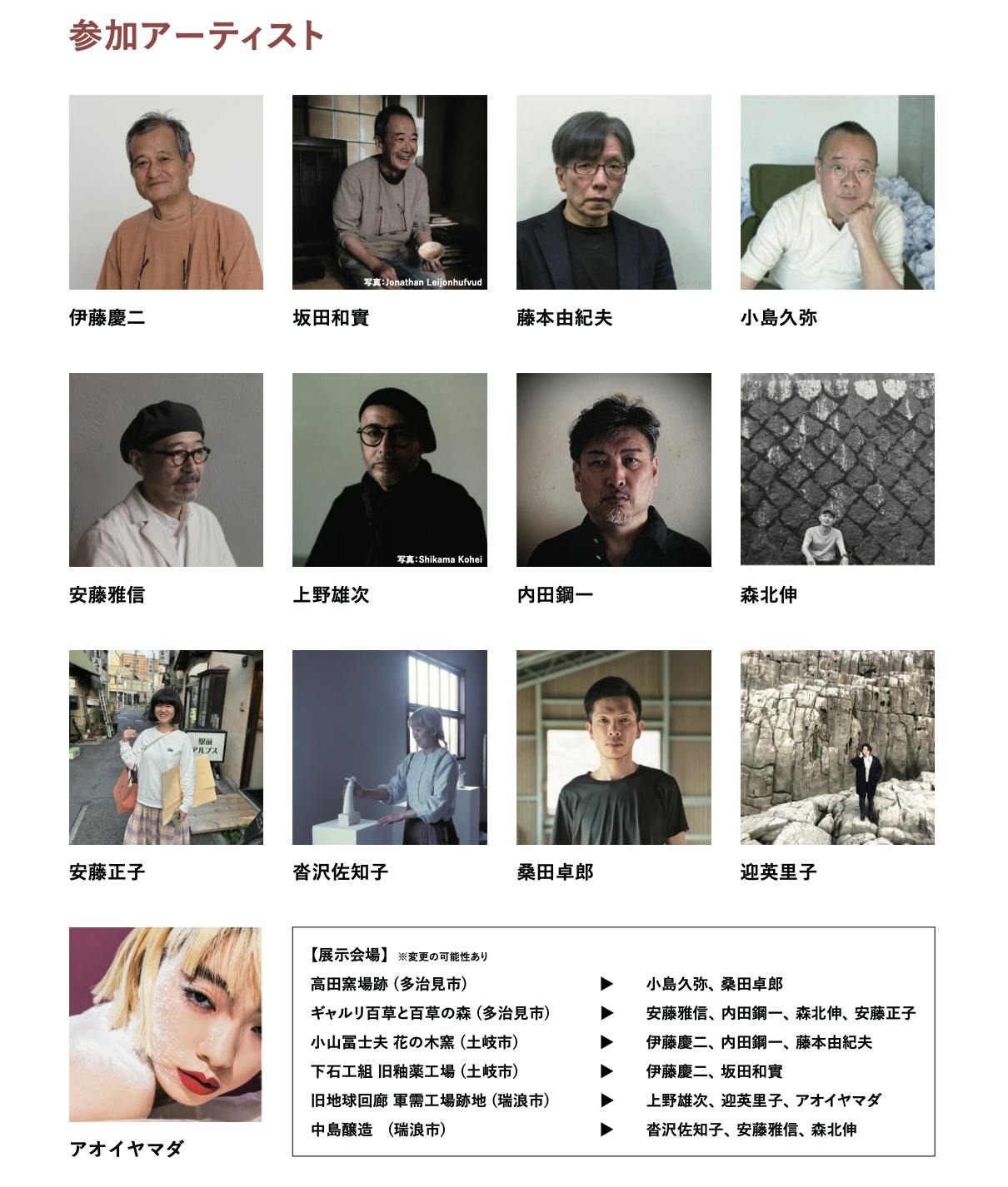 2024/10/03 13:30こんにちは!土から生える実行委員長の水野雅文です。土から生えるのクラウドファンディングにご賛同いただき、誠にありがとうございました。目標金額は700万円。支援総額は5,487,200円、支援者数は491人です。本当に本当にありがとうございました。今回、一人でも多くの方に土から生えるのことを知って欲しくてクラファンに取り組みました。伝えることは感謝の気持ちとともにこれからも続けていきます。まだまだ土から生えるをご存知ない方も多いと思いますので、引き続きみなさんのお力添えもお願いいたします。10月になり各地での準備が佳境です。今回はみなさんからいただいた気持ちが支えになりました。開催までどうぞ見届けてください。会期中のイベントもオンラインサイトにて予約受付中です。展示とともに楽しんでもらえたら幸いです。以下、一部イベントのご紹介です。パフォーマンス アオイヤマダ×上野雄次+KzO 「土から生える」 軍用工場として掘られたトンネル 。 負の記憶を孕みながらのちに地球回廊という壮大な名が付けられ現在はただの空っぽな闇の世界へと変容している。 その空間に花道家 上野雄次の手によりしつらえられた作品が出現、それを舞台にアオイヤマダと上野雄次が呼応するかの様にパフォーマンスを繰り広げる、更にアーティストKzO がプロジェクションマッピングで色を付けていく。 全ては今という時と共に、どうなるかは誰もしるよしもない。日程:10/20(日) 16:00開演(15:30開場)会場:旧地球回廊 軍需⼯場跡(〒509-6133 岐阜県瑞浪市明世町戸狩 67-1 ※瑞浪市民公園内)駐車場:瑞浪市⺠公園敷地内入場料 :2,000円・未就学児童入場不可・高校生以下の鑑賞パスポート不要の方も、こちらのイベントはチケットが必要になります。・別途、作品鑑賞パスポート(前売り/一般/学生/フリーのいずれか)が必要です。会場入り口にてご提示いただきます。・会場内は気温が低いため、上着など各自ご用意ください。▶ご予約はこちら(土から生えるオンラインストア)トークイベント 沢⼭遼×⾼橋綾⼦ 「レッサー・アート(小芸術)の力を見る」講師:沢山遼(美術批評家・武蔵野美術大学美学美術史研究室准教授)対談「批評のあとさき」 高橋綾子(芸術批評誌『REAR』制作・名古屋造形大学教授) やきものと彫刻、あるいは工芸と美術とは、何がどう異なるのでしょうか。この問いを、芸術とは何かというところから発して、多様な人々の集いと語らいの場を得たいと思います。 沢山遼さんは、「芸術とは形を造りだすこと、すなわち造形である」という考えを基盤に活動する、気鋭の美術批評家です。美術だけではなく、工芸、建築などにも関心を寄せ、最近では坂田和實さんに関する論考もあります。一貫して生活のための道具に美を見出した坂田さんが徹底してそうであったように、ここでは「アノニマス」であることに注目して、工芸的なるものの意義を再考します。 「レッサー・アート(小芸術)」とは装飾芸術や手仕事の工芸のことで、ウィリアム・モリスが彫刻や絵画といった大芸術に対して使った言葉です。これを端緒とした沢山さんの講義に加え、批評の役割についても語り合います。日程:10/25(金) 18:30〜20:30(18:00開場)会場:THE GROUND MINO (〒507-0033 岐阜県多治見市本町 6-2)駐車場:敷地内と近隣コインパーキング入場料:1,000円 現地でのワンドリンクオーダーをお願いします。▶ご予約はこちら(土から生えるオンラインストア)トークイベント 伊藤慶二×岩島利幸×安藤雅信「土から生える 人は土に何を求めてきたか」縄文時代の土器作りは、燃えた籠の底に付いていた土が硬くなったことから始まったという説がある。真偽はさておき、それから人は一万年以上、地表に露出している粘土を探し求め続けた。 明治時代に工業化が始まると、地表の粘土は足りなくなった。そこで山を掘り、磁器土を安定的に供給する職業が起こる。カネ利陶料さんはその一つ。昭和に入れば、陶芸・クラフト・オブジェなどの作り手が現れ、彼らは工業製品向けとは異なる土を求めた。昭和・平成・令和まで土の需要の変遷を体感してきたカネ利陶料の岩島利幸さん、日根野作三のクラフト指導からオブジェへと幅広く土を形にしてきた作家・伊藤慶二さんとともに、土をテーマに焼物史を振り返る。日程:11/10(日) 14:00〜15:30 (美濃焼ミュージアム 開館時間 9:00〜17:00)会場:多治見市美濃焼ミュージアム (〒507-0801 岐阜県多治見市東町1-9-27)駐車場:敷地内入場料:1,000円 ※美濃焼ミュージアムの鑑賞料も含みます▶ご予約はこちら(土から生えるオンラインストア) もっと見る本日終了です!!!