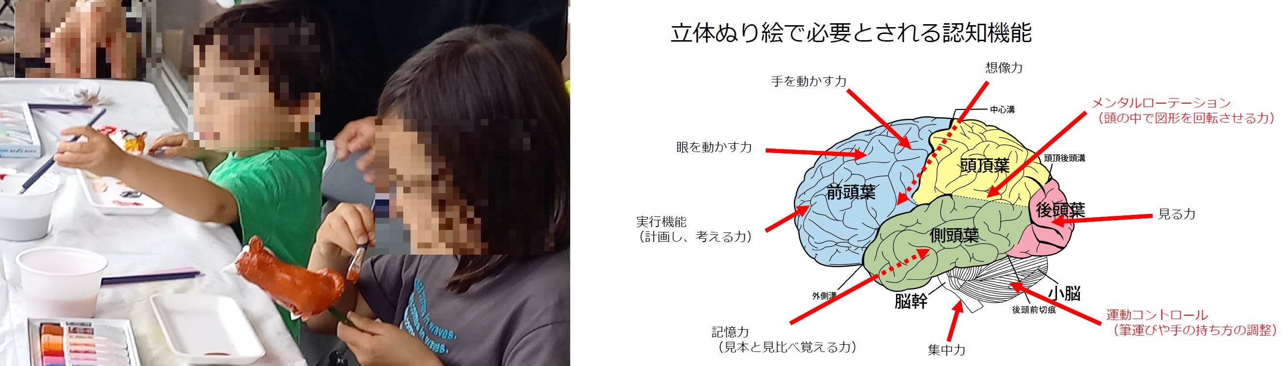立体へ着色することによって、空間認知能力を刺激し、知育教育や脳のトレーニングに効果があるといわれています。
