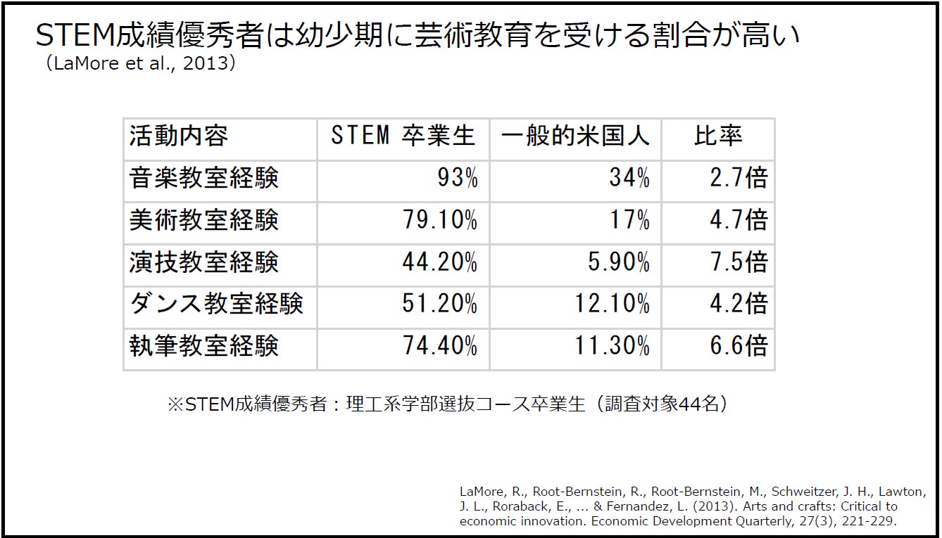 近年の教育では、テクノロジーを使いこなすだけでなく、クリエイティビティを発揮するほうがより現代に求められるという視点から、STEM(科学、技術、工学、数学)にART(芸術)を加えたSTEAM教育が提唱されるようになりました。STEM成績優秀者の多くは幼少期に工芸経験があるというデータもあります。