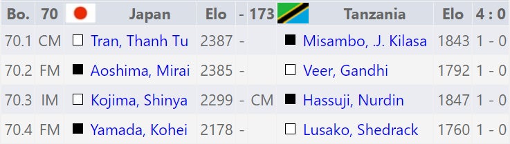 オープンチームはTu選手、青嶋選手、小島選手、山田選手が出場。難しい試合もありましたが、最終的には全員が勝利を挙げ、4.0-0.0の完勝でした!チェスオリンピアード初出場の青嶋選手は、初戦で初勝利を挙げました。