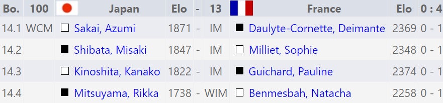 女子チームは坂井選手、柴田選手、木下選手、三津山選手が出場。かなり格上の相手に善戦するボードもありましたが、0.0-4.0で敗北。チーム、個人ともに初ポイントはお預けとなりました。