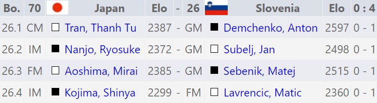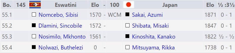 日本時間22時から第2ラウンドが行われ、オープンチーム(70)はグランドマスター4人を擁する強豪スロベニア(26)と、女子チーム(100)は南アフリカのエスワティニ(145)との対戦でした。