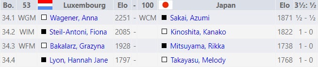 女子チームは坂井選手、木下選手、三津山選手、高安選手が出場。坂井選手がWGMのタイトルを持つ相手からドローを奪いました!他のボードでも果敢に攻め込みましたが、結果には繋がらず、0.5-3.5での敗戦となりました。これで女子チームは1勝2敗となっています。