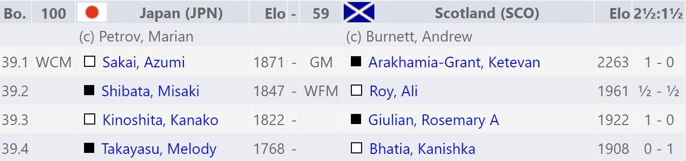 女子チームは坂井選手、柴田選手、木下選手、高安選手が出場。高安選手は負けてしまいましたが、柴田選手が格上の相手から手堅くドローを奪うと、坂井選手、木下選手が難解な展開から一歩抜け出しそのまま勝利!結果2.5-1.5で格上のスコットランドを下し、後半戦に入ってから3連勝!女子チームは5勝4敗と星を伸ばしています。また個人で7戦中3勝1ドローを挙げている柴田選手は「7試合以上プレーして勝率50%以上」の条件を満たしたため、ウーマンキャンディデートマスター(WCM)のタイトル獲得が確定。日本にまた一人、新たなマスターが誕生しました!
