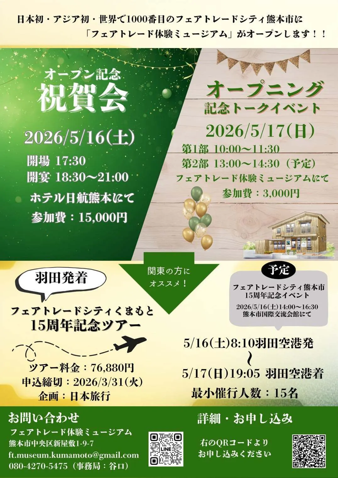 2026/03/07 09:00クラウドファンディングの挑戦から今日まで、温かいご支援を送り続けてくださった大切な皆さまへ。明石祥子です。あの時、皆さまから託していただいた総額278万円という多大なるご支援と、数えきれないほどの応援コメント。その一つひとつが、私の背中を押し続け、ついにこの日を迎えることができました。本当に、ありがとうございます。2016年の震災から10年。皆さまと共に描いた夢の続きが、いま、日本初の「フェアトレード体験ミュージアム」という形になって、熊本の地に誕生します。ここは、単なる展示施設ではありません。食べて、学んで、体験して――。フェアトレードが当たり前になる未来を、次世代の若者たちと共に育て創っていくための拠点です。現在も20人のボランティアの若者たちが、情熱を持って準備に加わってくれています。皆さまの想いが結実するこの歴史的な瞬間を、ぜひ共にお祝いさせていただきたく、祝賀会とオープニングイベントのご案内を申し上げます。(以下、祝賀会・イベント詳細) 5月16日(土):祝賀会・記念行事• 午後: 「フェアトレードシティくまもと15周年」記念行事(案)主催 熊本市共催 フェアトレードシテイくまもと推進委員会後援 日本フェアトレードフォーラム• 夜: フェアトレード体験ミュージアム開設祝賀会(ホテル日航熊本 18:00〜)• 会費:15,000円(税込)• 皆さまと直接お会いし、感謝をお伝えできることを楽しみにしています。 5月17日(日):ミュージアム・オープン• 一日館長: 長坂寿久先生• 会場: フェアトレード体験ミュージアム【お申込み・詳細はこちらから】https://forms.gle/dC9npsQrD2ZXZK9UA(第一締切:3月31日)あの日、クラウドファンディングのページを通して繋がった皆さまの想いが、このミュージアムの柱となっています。この場所を、熊本、日本、そして世界に誇れる場所に育てていく決意です。当日、会場で「あの時はありがとうございました!」と、皆さまお一人おひとりにお伝えできることを、心より願っております。明石祥子 もっと見る年末年始のご挨拶