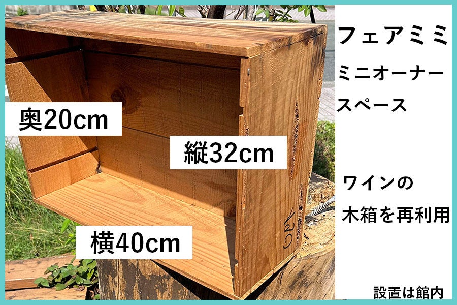 仮設店舗でも活用していた、ワインの木箱を再利用した展示スペースです。
