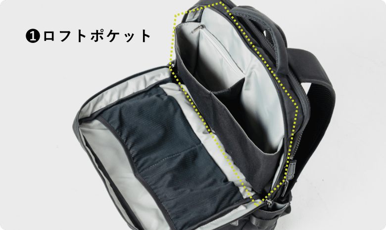 ①ロフトポケット:時短ポーチやメガネケース、マウスなど大きめのアイテムを収納