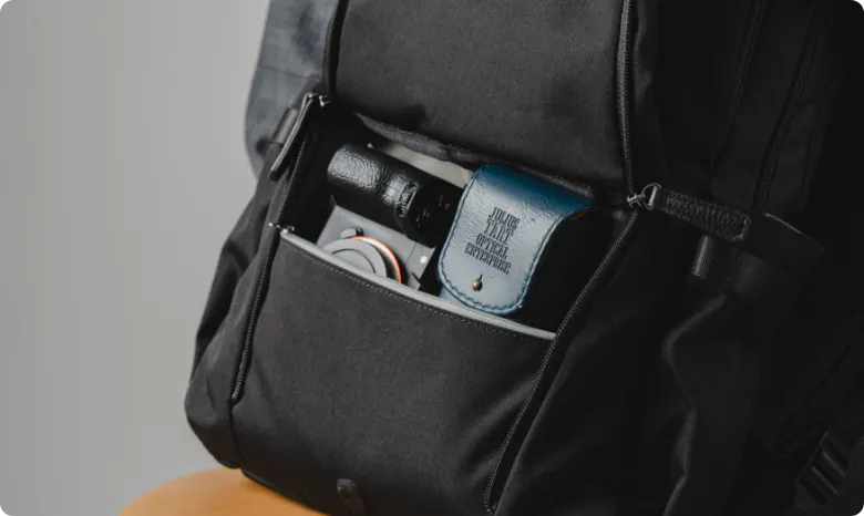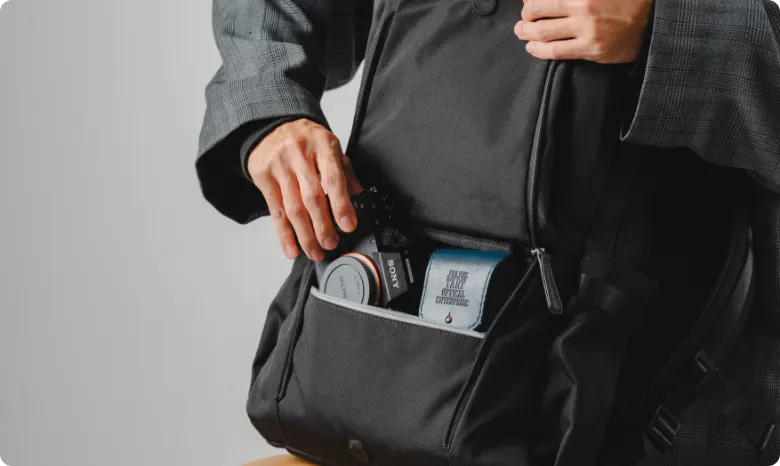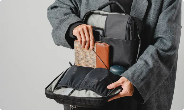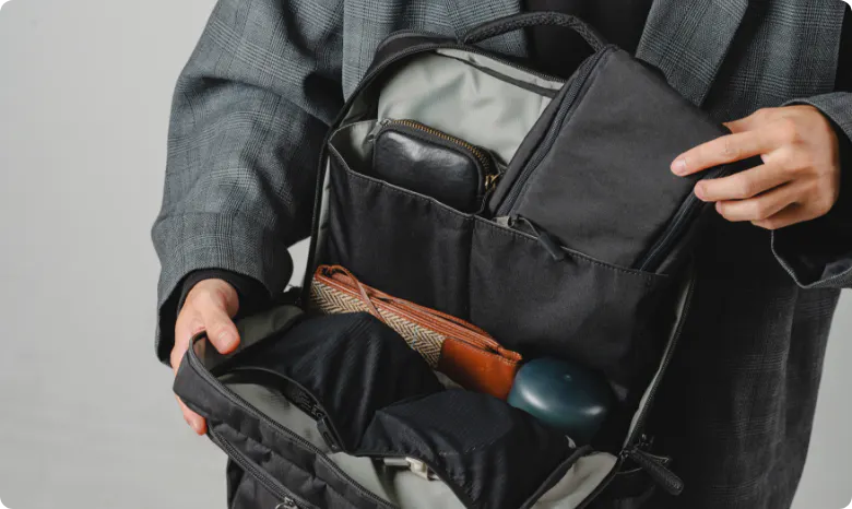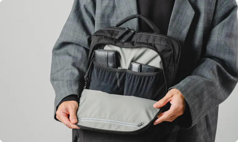 ポケットの仕切りも搭載しており、アイテム同士が直接当たって傷がついてしまうのを防ぎます。