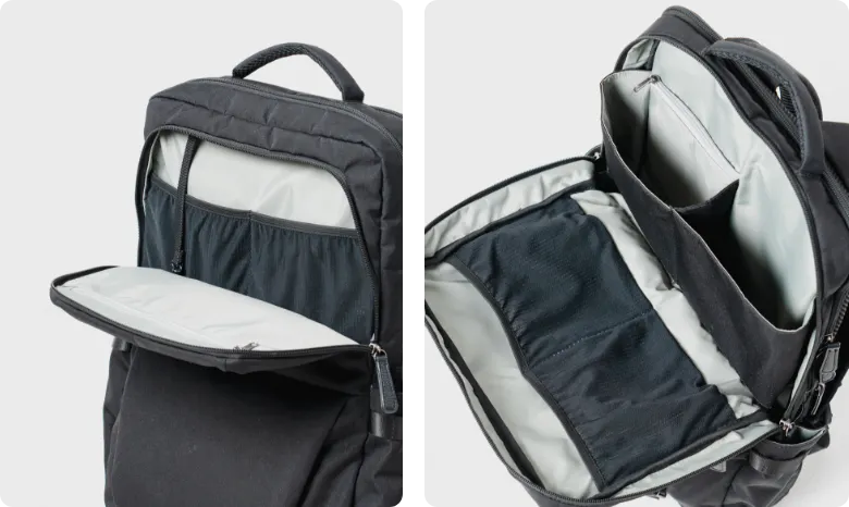 ロフトポケットによる2階建て構造で、バックパックの収納スペースを上下に分割。荷物のサイズに合わせて、適切な場所にモノの定位置を決められる。「タイパ」意識の向上を目指し、時短収納を実現したバックパックです。
