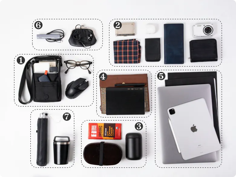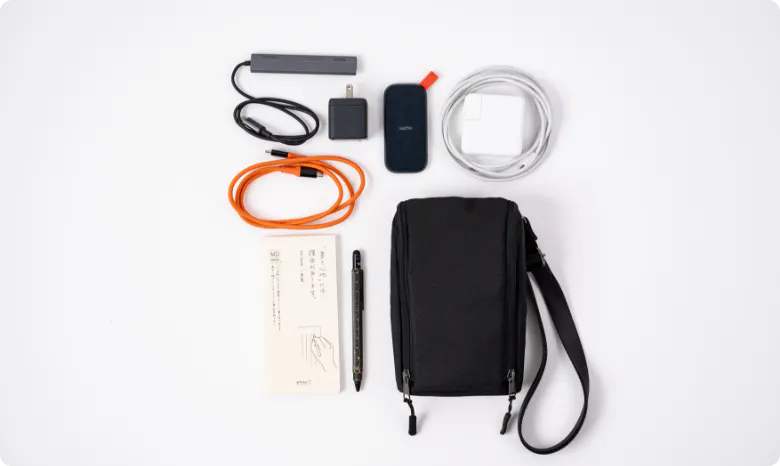 ペンや充電器など、必要なものをスマートに持ち運んで移動できる、時短ポーチをご用意しました。