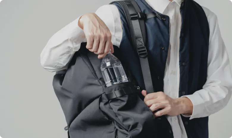水筒や折り畳み傘は左右のサイドポケットへ。