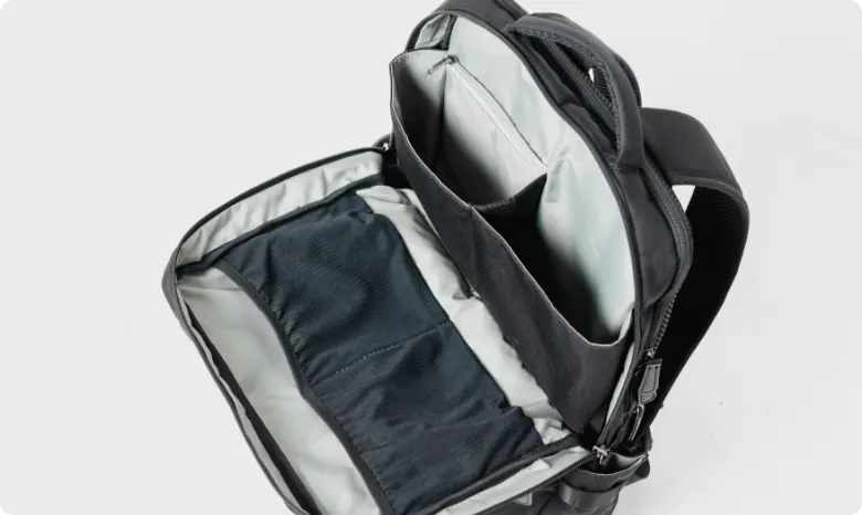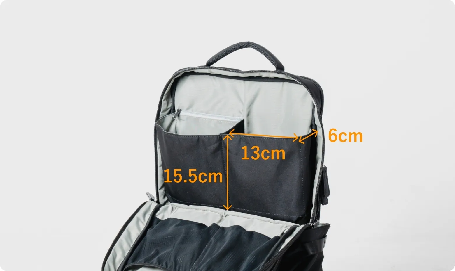 一般的な構造のバックパックではデッドスペースになってしまうことの多いバッグ上部。
