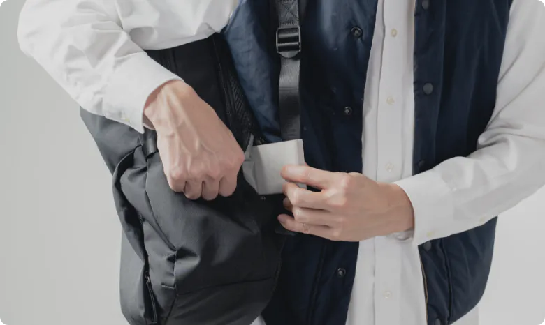 背面のシークレットポケットはサイドからの出し入れが可能。パスケースなどを背負ったままスムーズに取り出すことができます。