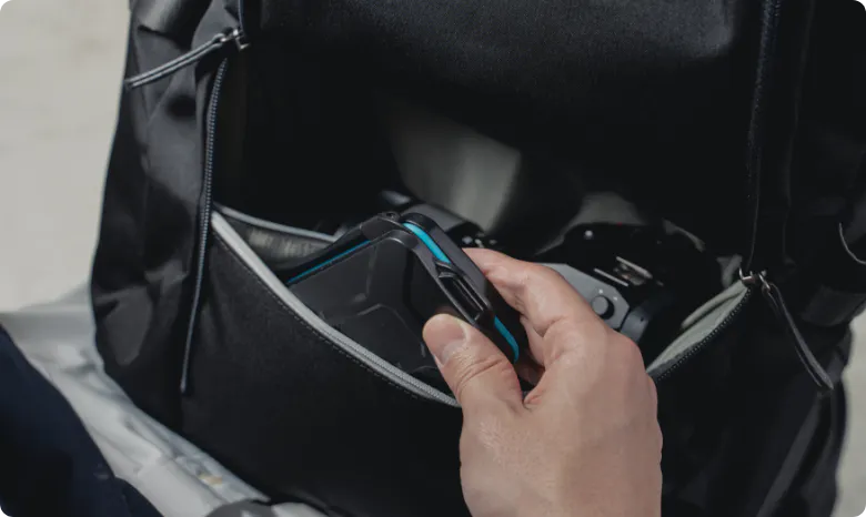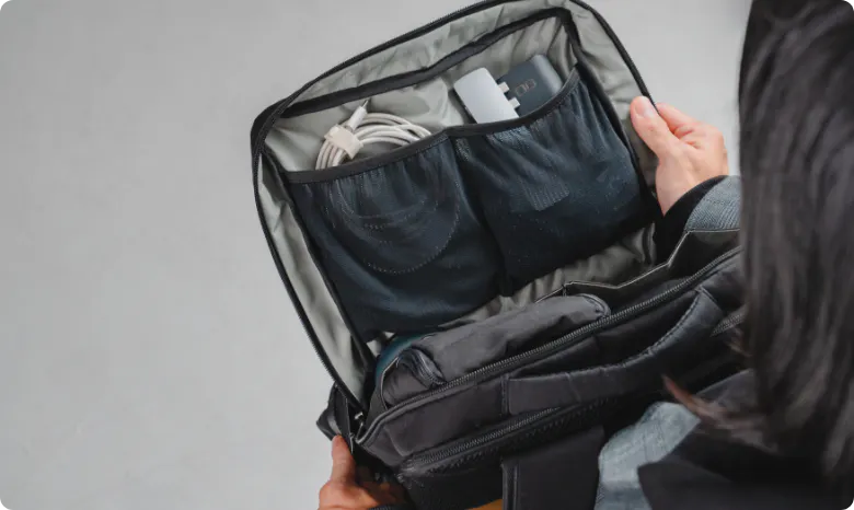 ロフトポケットの対岸にはメッシュポケットも備えられているので、エクストラで持ち運ぶケーブルやモバイルバッテリーなどの小物はこちらにまとめてもOK!