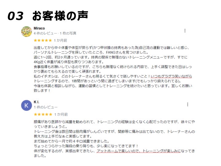お客様からよく聞く例を出すと、食事指導がとても厳しく食べたら怒られる、食事を送らないと電話がくる、体重が増えたら強制的にバイクを漕がされる、食事制限をしすぎて拒食症になるなど、お客様のご意見を尊重していない指導が多々あります。