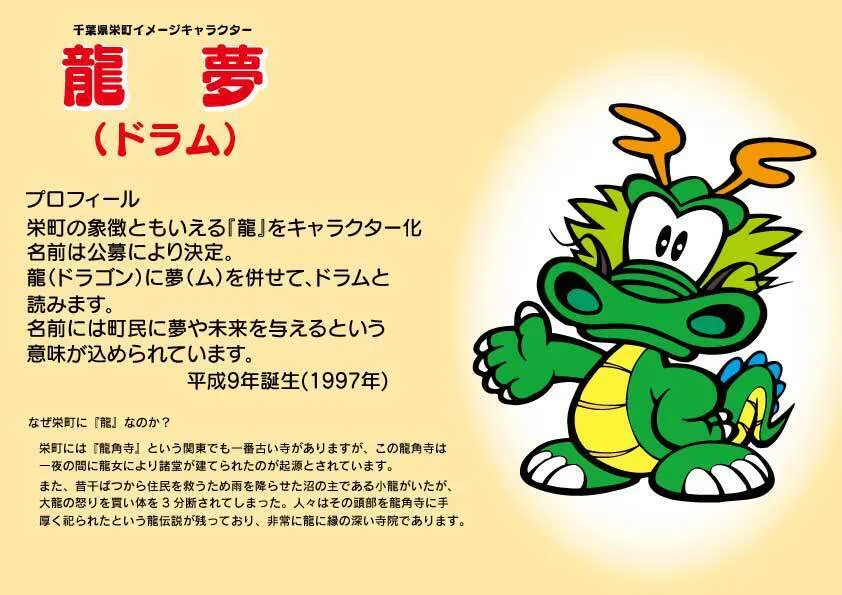なんといっても今年は「辰(龍)年」!!龍伝説のある栄町のイメージキャラクター「龍夢(ドラム)」の年でもあります。